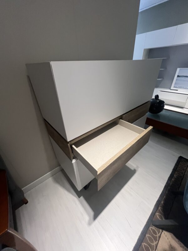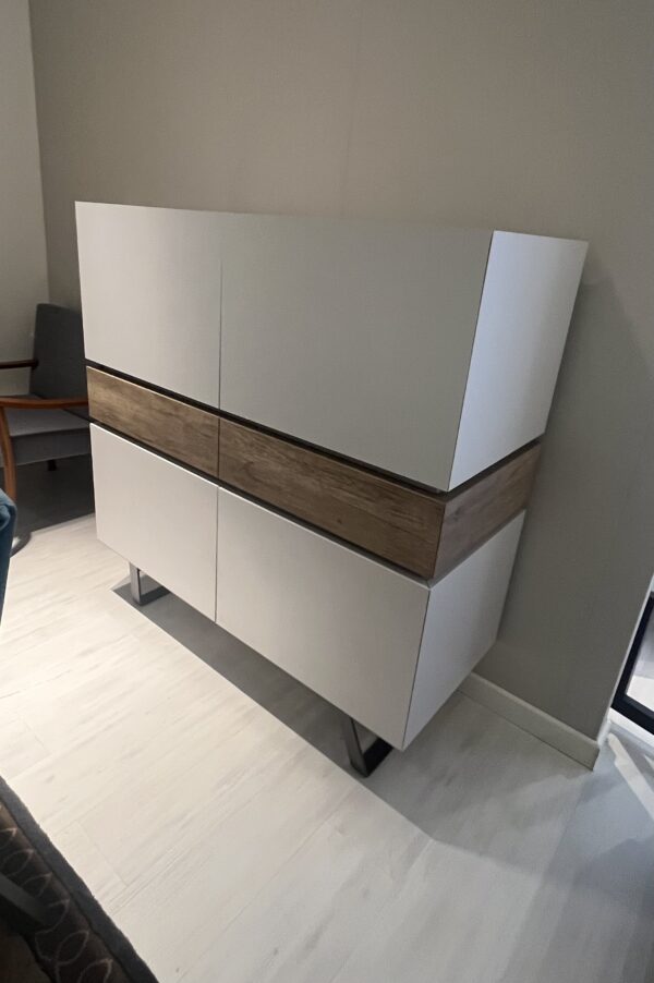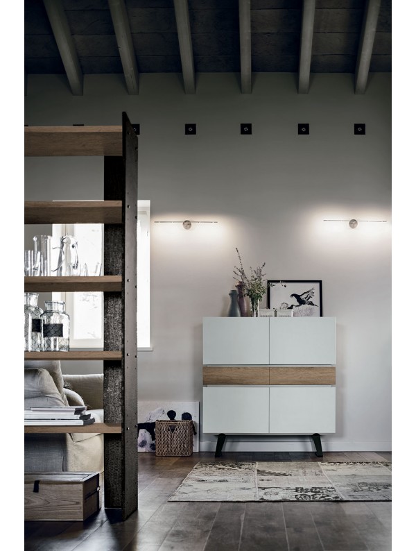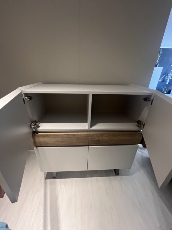 Madia in laminato a quattro ante e due cassetti con bordo superiore lavorato tutto a 45°. Piedini in metallo verniciato. Finiture: Ante laminato perla ,cassetti rustici l.120.00 cm pr. 50.00 cm h.126.00 cm